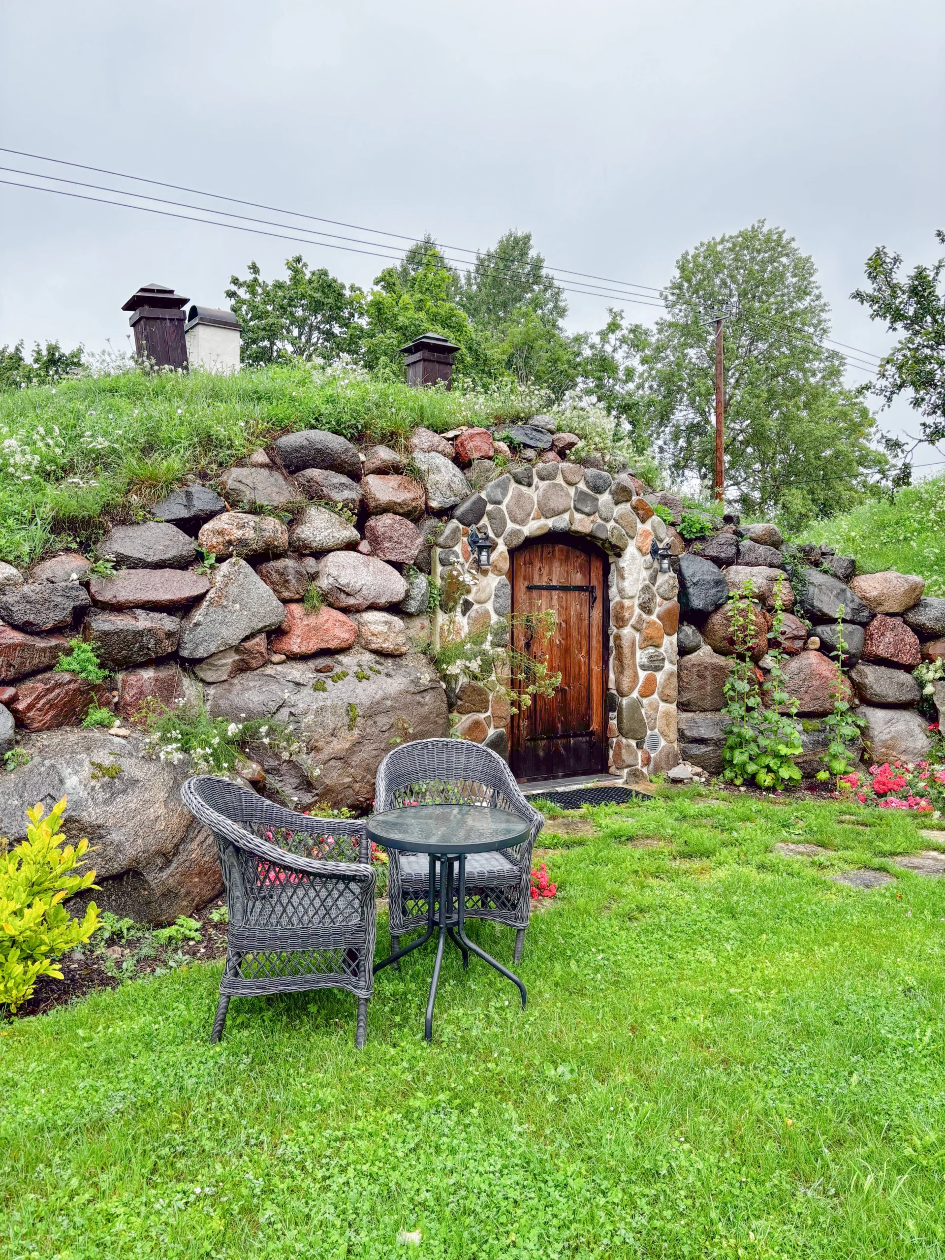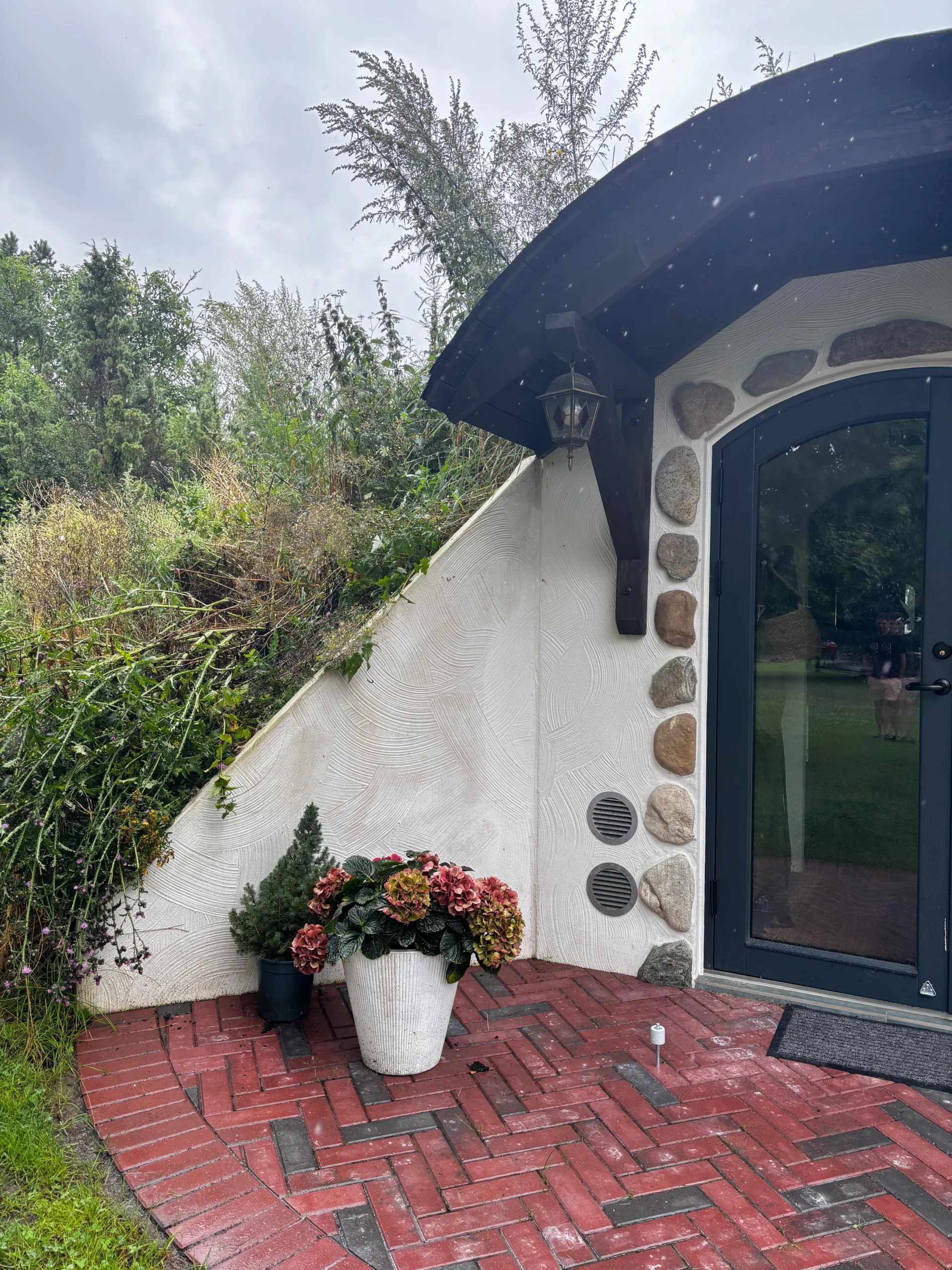 Aluksi voi tuntua hieman oudolta, että puutarhamaja on peitetty maalla. Tämä on kuitenkin iso plussa, mikä tekee rakennuksesta erittäin energiatehokkaan.