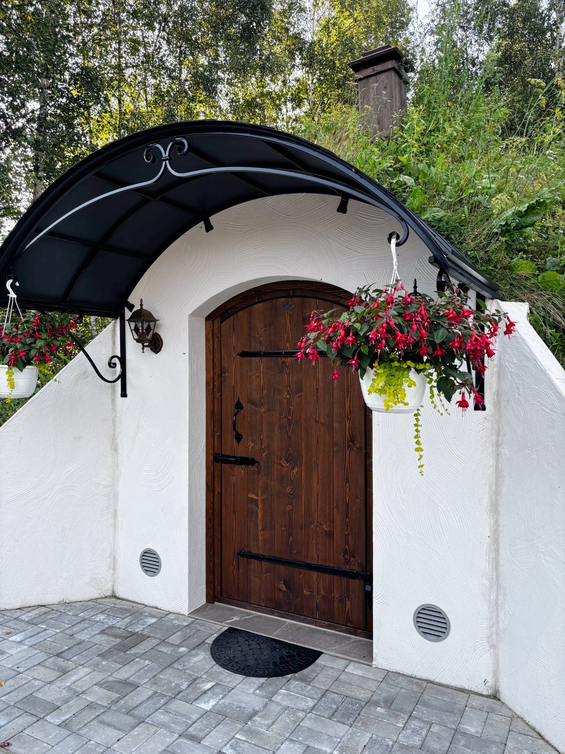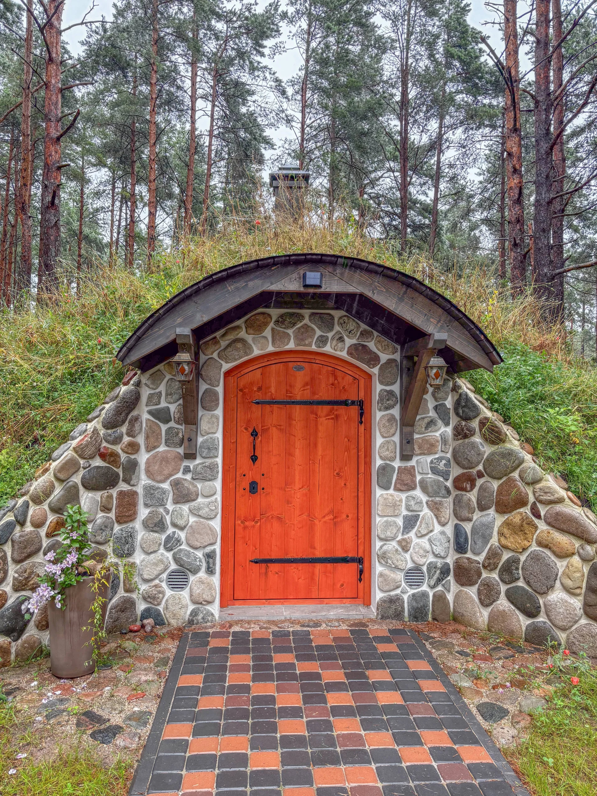 Hiidenmaan rauhallisissa metsissä tämä kellari sulautuu maisemaan kuin itsestään. Lämmin puuovi, pehmeä valkoinen rappaus ja elävä viherkatto heijastavat saaren luonnollista rytmiä, samalla kun viileä sisätila pitää sadon tasaisena läpi vuodenaikojen.